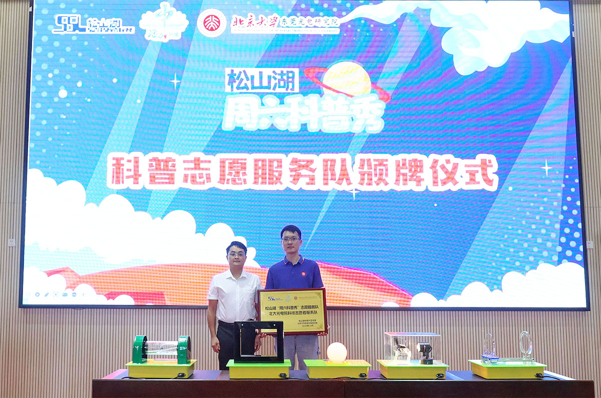 讲座尾声,现场举行简约而庄重的授牌仪式。松山湖中部片区党委代表屈晓斌委员向研究院授予“北大光电院科技志愿者服务队”牌匾,这一仪式标志着研究院科普志愿服务工作迈入新阶段,未来将持续为公众提供更多的优质科普服务。