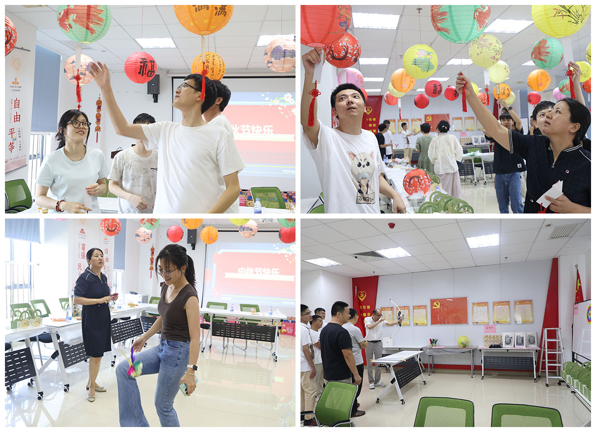 射箭体验区前,大家有序排队,握弓、瞄准与放箭,每一个动作都认真专注。每当箭矢命中靶心,现场便响起热烈掌声与欢呼声,喜悦氛围感染着在场每一个人;猜灯谜区充满文化韵味,融合中秋民俗与生活常识的谜题悬挂在灯笼之下,员工们或凝神思考,或轻声交流,偶尔还会为一个谜题的答案展开小讨论;踢毽子区域则唤起了许多人的童年回忆,大家轮番上阵,脚尖翻飞,毽子在空中轻盈跳跃,喝彩声此起彼伏。每赢得一局游戏,参与者都能获得U型枕、养生锤等实用又贴心的小奖品,在收获欢乐的同时,更感受到满满的自豪与满足。